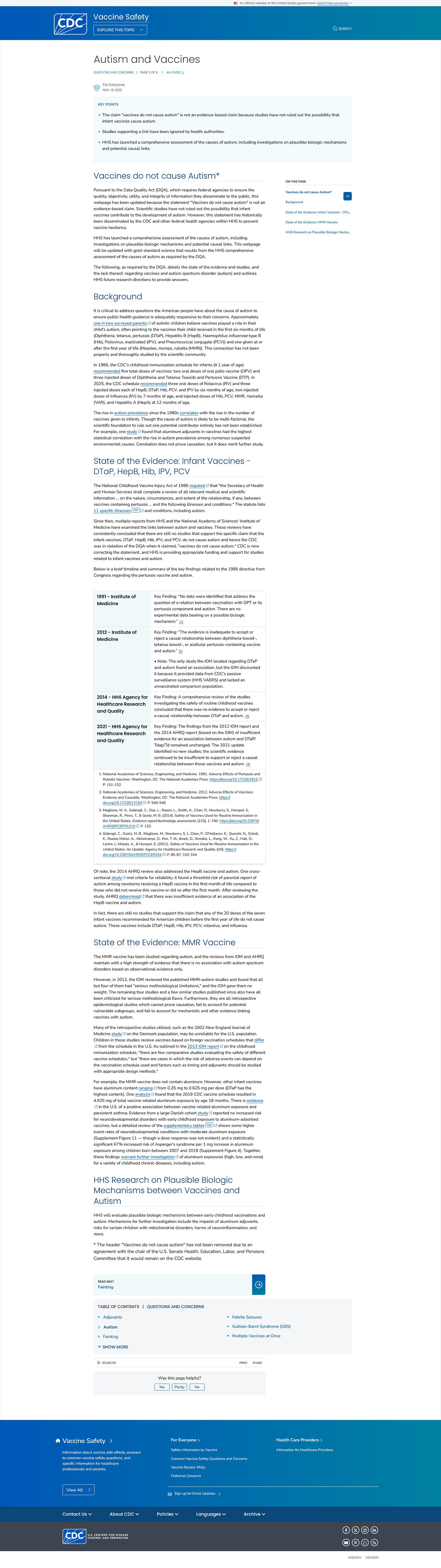 “No data were identified that address the question of a relation between vaccination with DPT or its pertussis component and autism. There are no experimental data bearing on a possible biologic mechanism.”