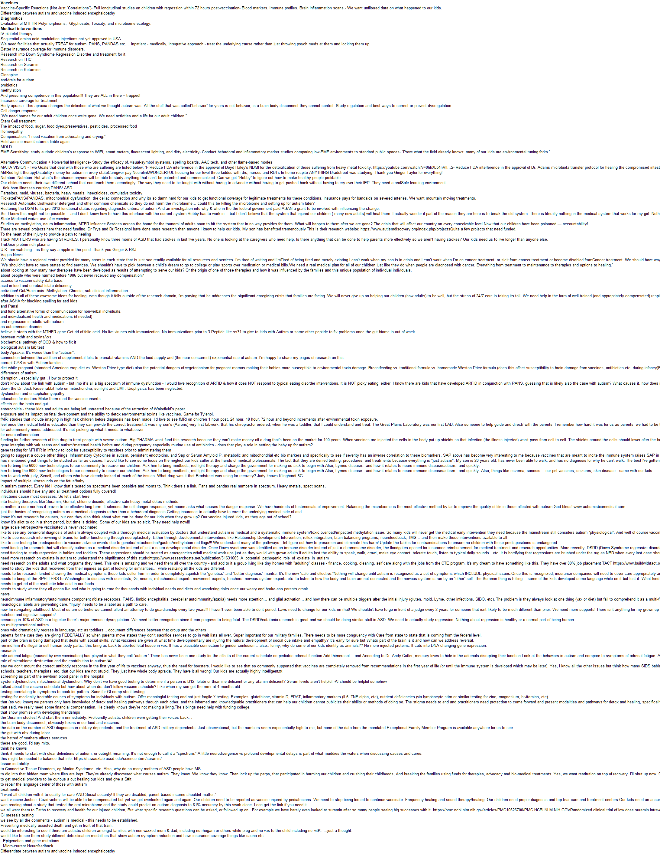 • Research on THC, IV platelet therapy, Sequential amino acid modulation injections not yet approved in USA, Suramin, Ketamine, Clozapine, antivirals for autism, probiotics, methylation, Stem Cell treatment, Homeopathy, MrtRed light therapy, Hyperbaric oxygen therapy, Micro-current Neurofeedback, Gcmaf, chlorine dioxide, effective safe heavy metal detox methods, Vitamin and mineral replacement like mB12.
